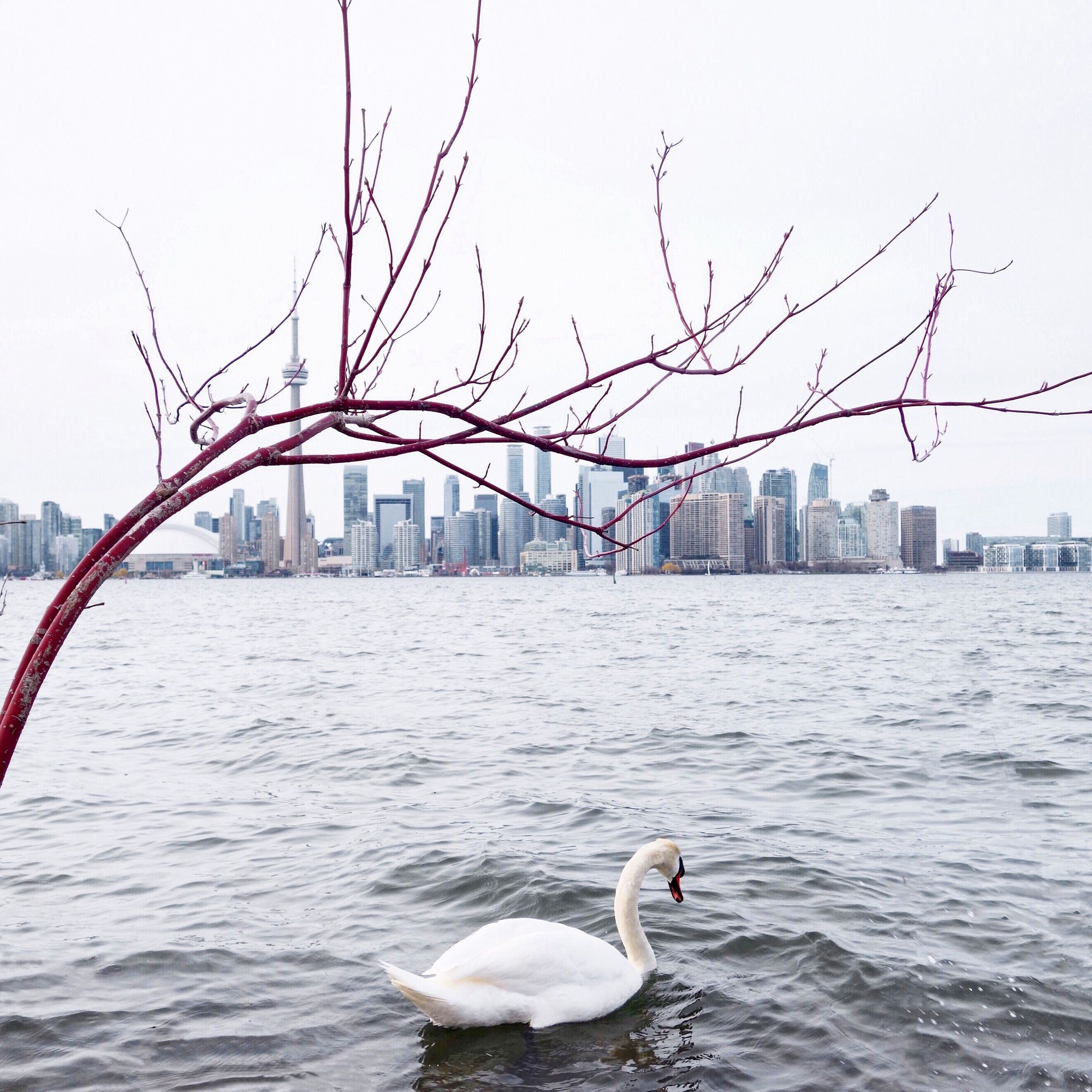 The harsh early afternoon sunlight eased into soft April greys as we made the short crossing from the city to the islands. The idea was to stay there until sunset to romance the skyline but too-light coats and our first Canadian chill had other plans. Shivering bodies and chattering teeth are not so idyllic, but the arrival of the swan gave us a fleeting fairytale moment beneath the redtwig shrub.